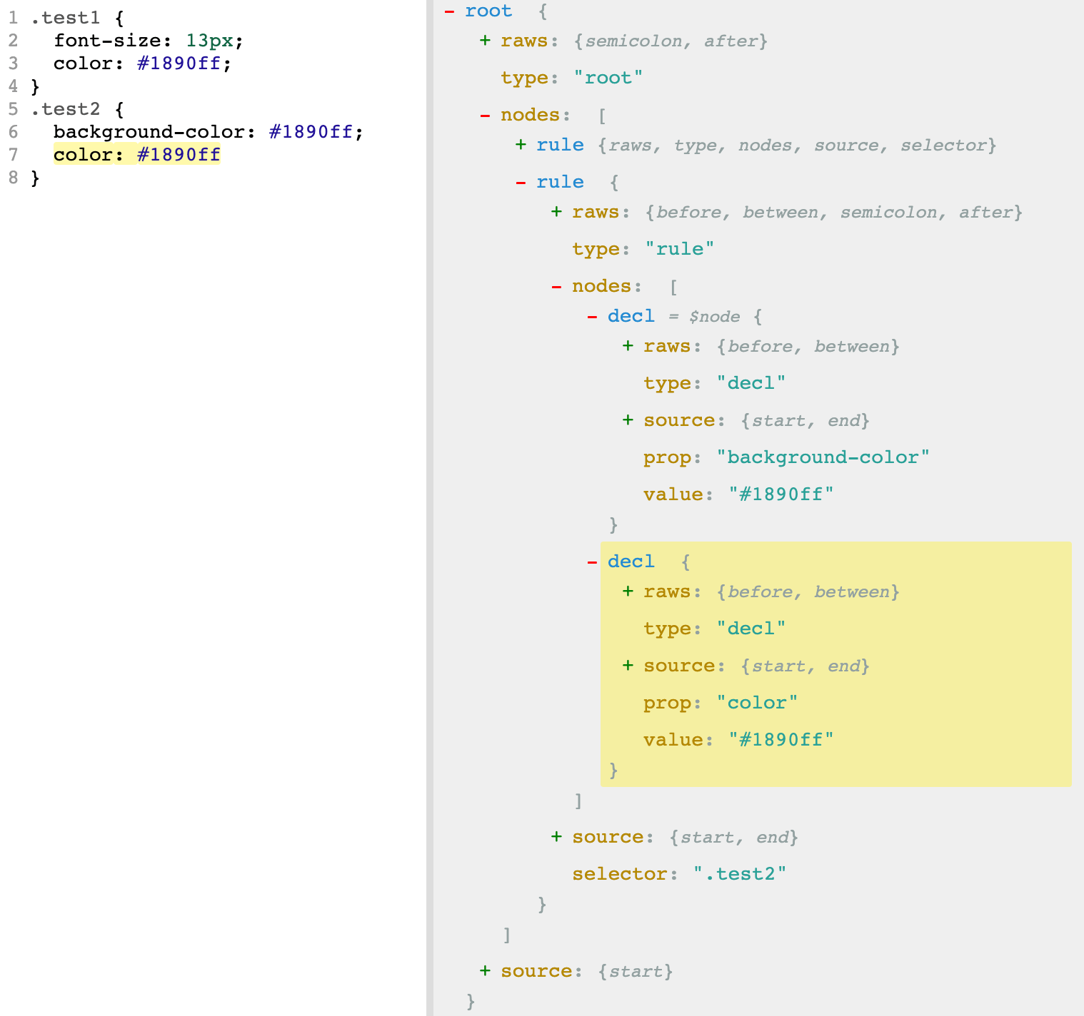 在项目中经常会用到 PostCss 做一些插件化的事情包括 AutoPrefixer 等,PostCss 会将 css 样式转为 AST 树方便处理,基于此可以对 AST 上的节点信息做一些处理以贴合本次的需求。如下是一个 PostCss 转换 css 的一个示例。来源于 astexplorer